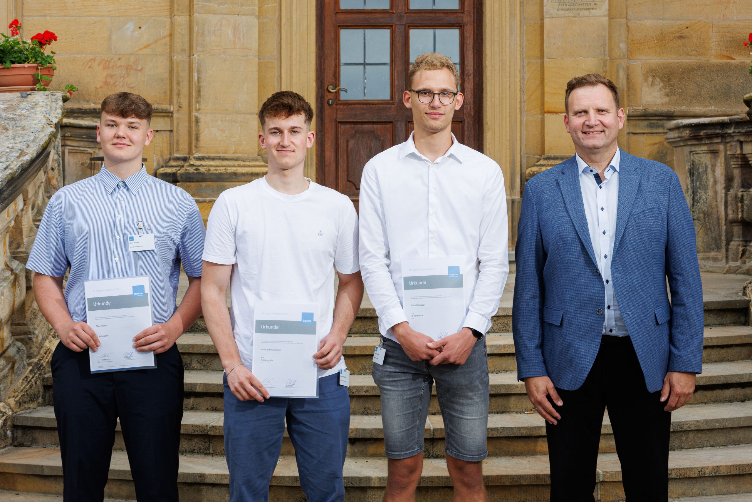 Vorheriges Bild Nächstes Bild 1545_vbw_kapp_2024_240619 Die 3 Preisträger des SBSZ Bamberg mit dem stellv. Schulleiter StD Günter Wawroschek