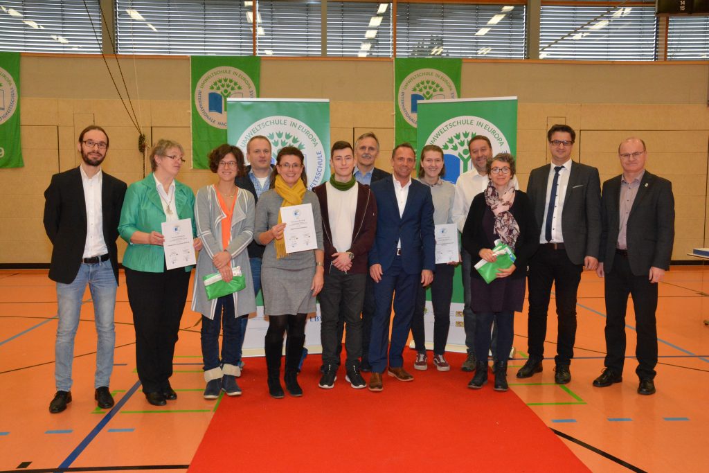Vorheriges Bild Nächstes Bild 20191128_1 Das 6-köpfige Team des SBSZ Bamberg nahm die Auszeichnung von Umweltminister Thorsten Glauber (6.v.r.) entgegen. Mit im Bild: Dr. Norbert Schäffer, Vorsitzender des LBV (r.) und Vertreter von Bamberger Umweltschulen Foto:StMUV