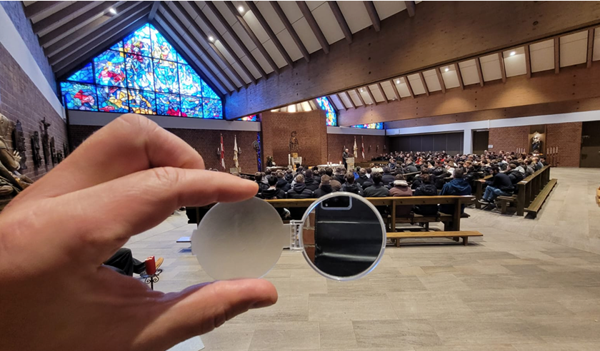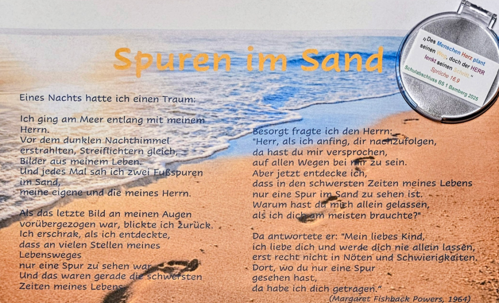 „Gott führt uns auf unseren Wegen“ – diese Botschaft gaben die Lehrkräfte der Religionsabteilung den Schülerinnen und Schülern mit auf den Weg. Sie stammt aus dem Gedicht „Spuren im Sand“ von Margaret Fishback Powers, in dem es heißt, dass wir Menschen darauf vertrauen dürfen, dass Gott bei uns ist, auch in Krisenzeiten. Das weisheitliche Bibelwort, das die Absolventinnen und Absolventen als Erinnerung auf einem Taschenspiegel mitnehmen konnten, ermutigt, das eigene Leben zu planen und Großes zu träumen, und dennoch zu wissen, dass nicht alles planbar ist und wir umso mehr darauf hoffen dürfen, dass Gott uns mit seinem Segen führt.