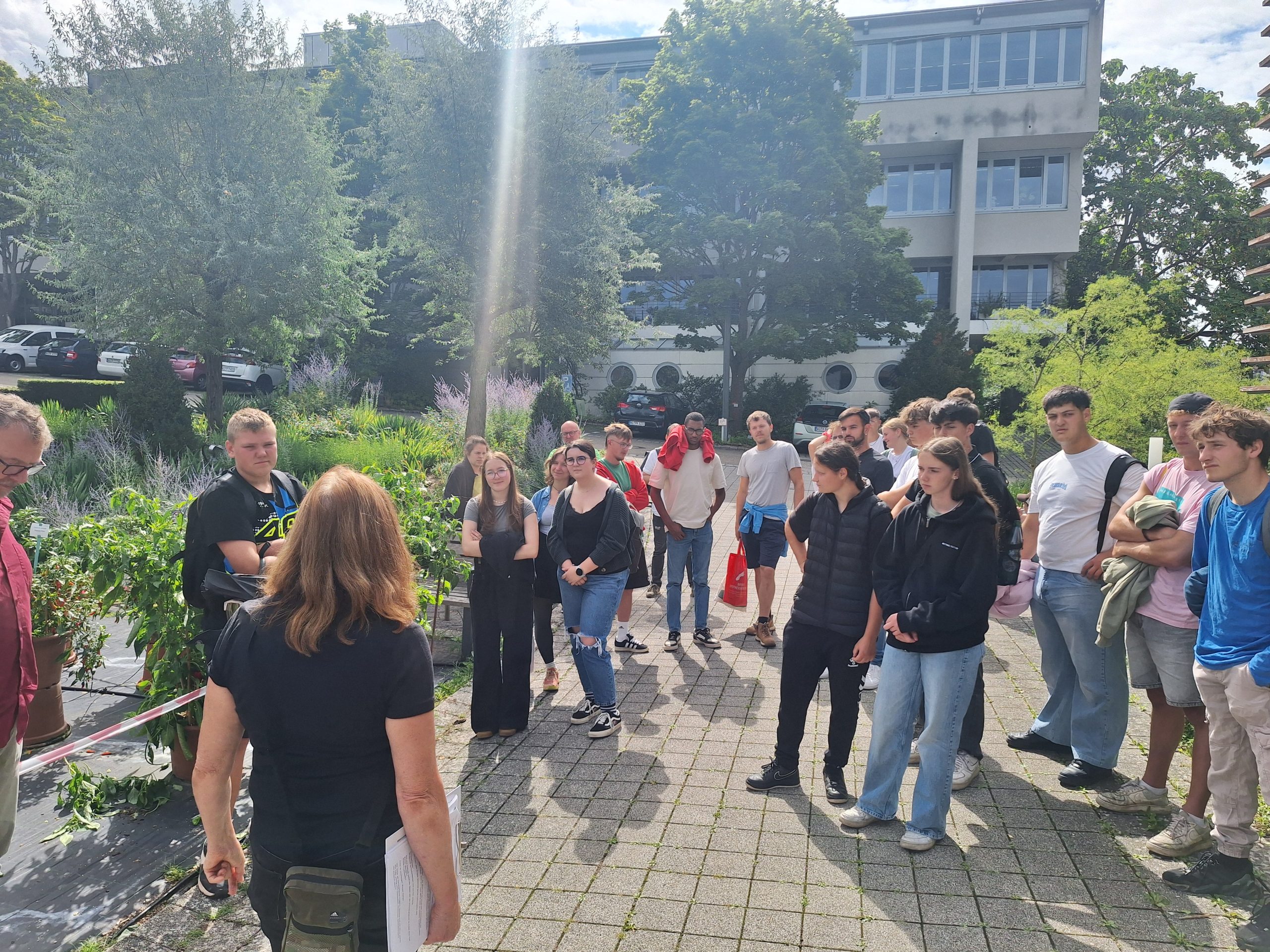 Vorheriges Bild Nächstes Bild LWG_08_25_3 Empfang durch Frau Bieker-Royackers und Kollegen vor dem Gewächshaus. Schüler und Schülerinnen sammeln sich und lauschen den einführenden Worten.